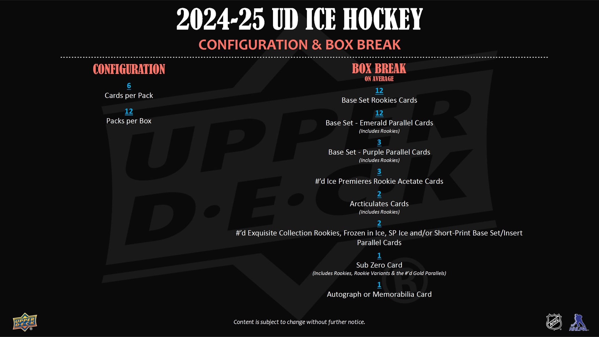 2024-25 Upper Deck Ice NHL Hockey Cards delivers (1) Autographed or Memorabilia Card, (3) Insert Cards, (3) Ice Premieres Rookie Acetate Cards plus (15) Parallels, (2) Numbered or Rare Ratio'd Cards and (12) Base Set Rookie Cards in Every Box!