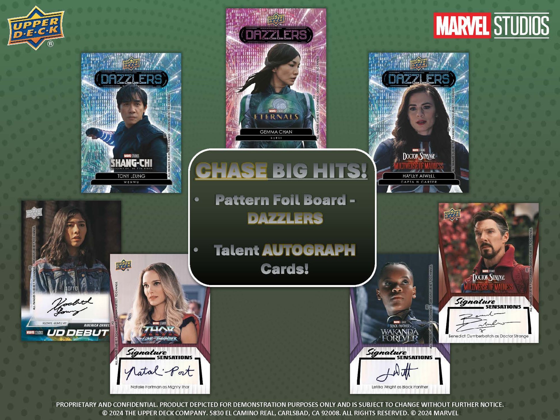 2024 Upper Deck Marvel Studios' Series 2 Cinematic Trading Cards delivers (2) Signature Sensations Autographed Cards, (6) UD Debut Cards, (4) Themed Insert Cards, (4) UD Canvas plus UD Debuts, (1) 1995 Collectors Choice SE Retro Card, (1) HoloGrFx plus Gold Parallel, and (1) Blue Dazzlers in Every Box (on average)!