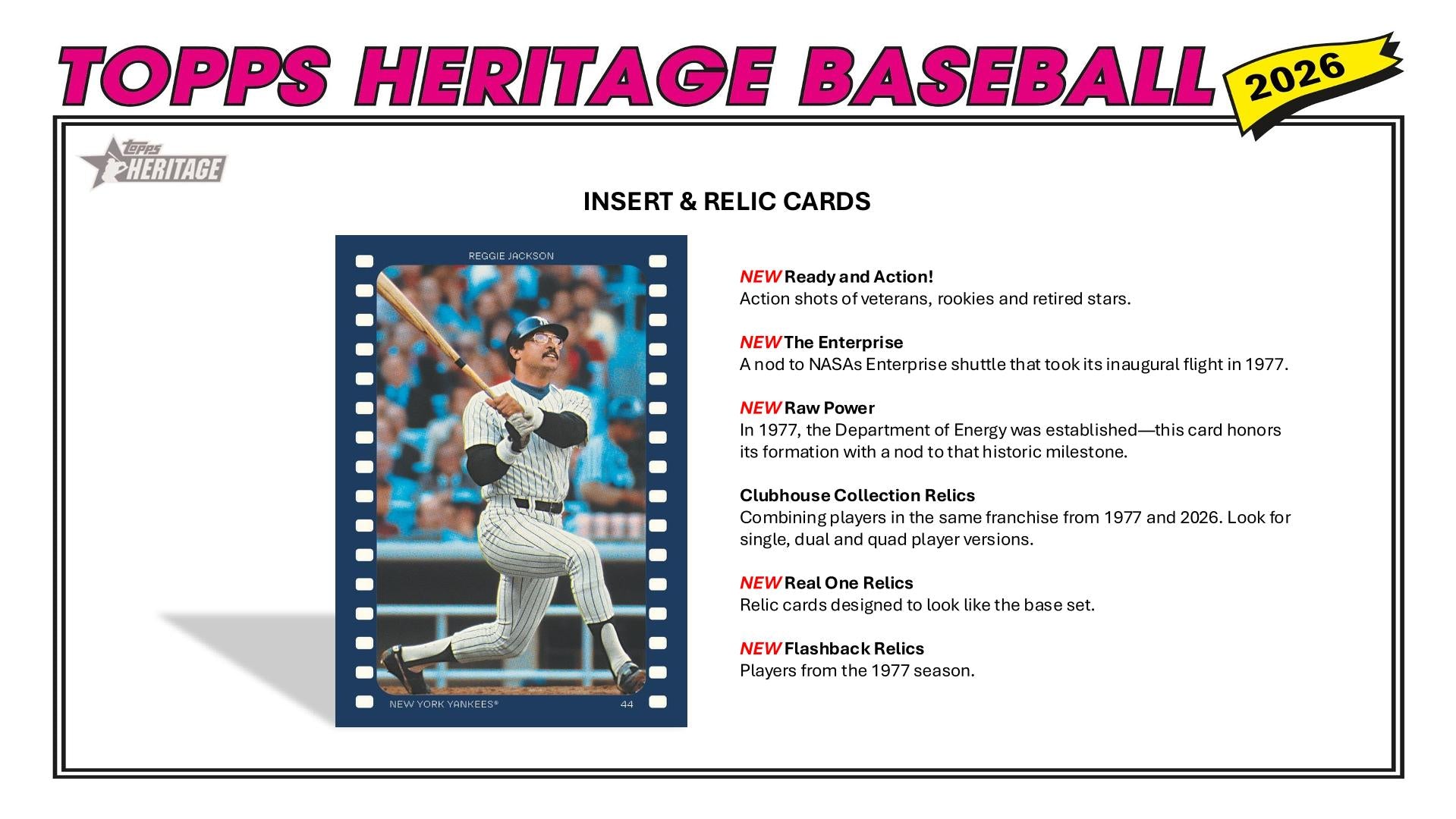 Step into 1977 with 2026 Topps Heritage Baseball. Designed for Collectors of every generation, Heritage combines a timeless Topps look with today’s most exciting stars and rookies.