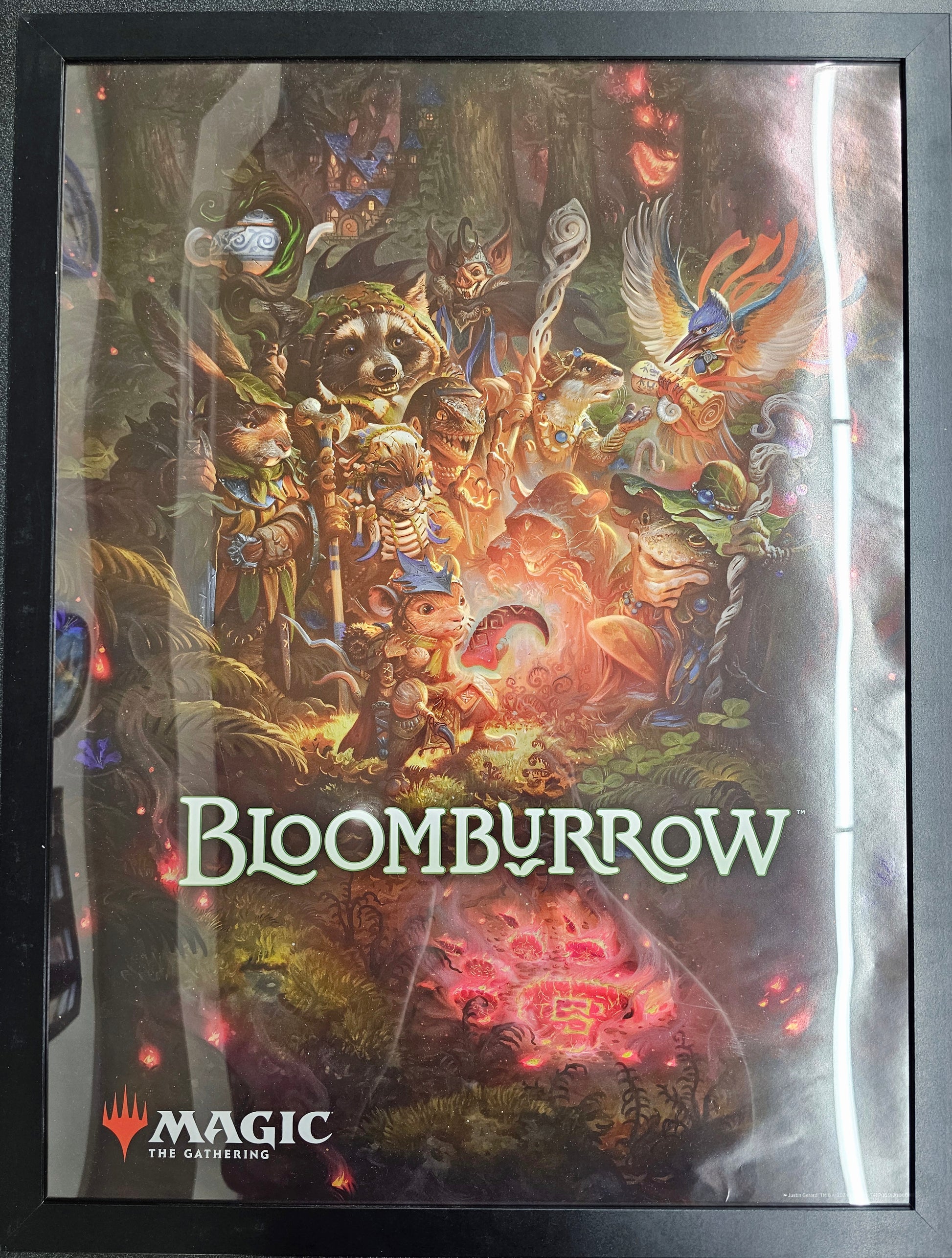This is a foil Wizards Play Network (WPN) promotional poster for the Bloomburrow set. It has been framed.