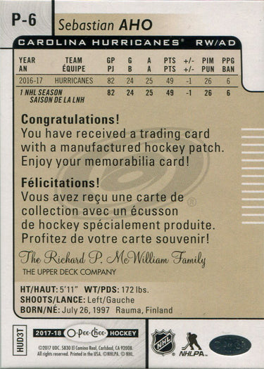 O-Pee-Chee Hockey 2017-18 Manufactured Patch Card P-6 Sebastian Aho