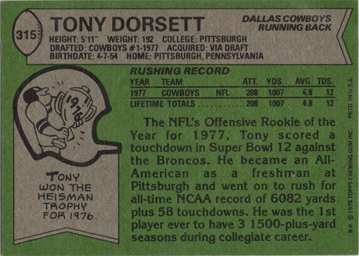 Topps Football 1978 Base Card 315 Tony Dorsett