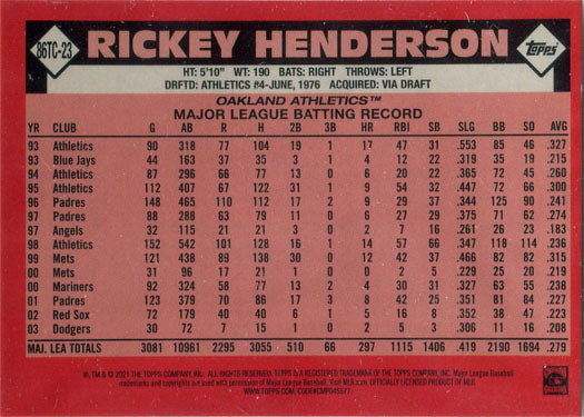 Topps Series Two Baseball 2021 Chrome Silver Card 86TC-23 Rickey Henderson